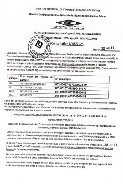 Appels d'offres الصندوق الوطني لغير الأجراء يعلن عن استشارة متعلقة باختيار محافظ حسابات للسنوات2025، 2026 ، 2027 Rosa Berranem 1 mois ago 36 Views La Direction Générale de la CASNOS lance un avis de consultation pour la sélection d’un prestataire pour la désignation d’un commissaire aux comptes . Rosa Berranem Publications similaires : Caisse nationale de sécurité sociale des non-salariés- CNAS إخطار شركات المقاولات و المكاتب الاستشارية العربية لتنفيذ المشاريع الممولة من قبل المصرف العربي للتنمية الاقتصادية في افريقيا مؤسسة إعادة التربية و التأهيل الحراش تعلن عن استشارة اختيار ممون للسنة المالية 2023 L’etablisement Public De Santé de Proximité de Baraki : Avis de consultation N° 21/2023