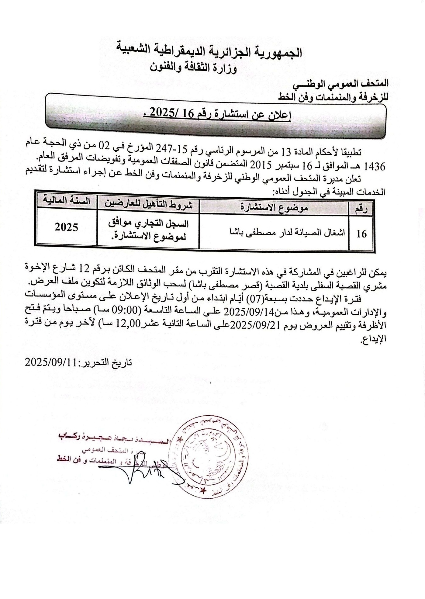 Appels d'offres المتحف العمومي الوطني للزخرفة والمنمنمات وفن الخط يعلن عن استشارة لتقديم خدمات أشغال الصيانة لدار مصطفى باشا Rosa Berranem 3 semaines ago 35 Views المتحف العمومي الوطني للزخرفة والمنمنمات وفن الخط يعلن عن استشارة لتقديم خدمات أشغال الصيانة لدار مصطفى باشا Rosa Berranem Publications similaires : إعلان عن طلب العروض دولي مفتوح متعلق بتقوية تزويدمدينة أغادير بالماء الشروب عن طريق تحلية مياه البحر Coopération algéro-béninoise CDER: Avis de consultation relatif à l’acquisition, l’installation et la configuration d’un pare-feu Appliance informatique pour 350 postes avec licence الديوان الوطني للامتحانات و المسابقات