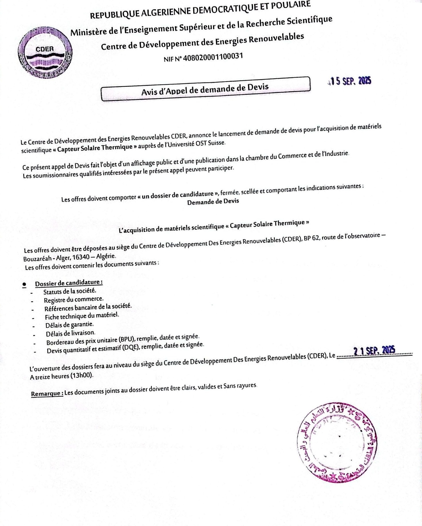 ActualitésAppels d'offres Le Centre de Développement des Énergies Renouvelables annonce le lancement de demande de devis Rosa Berranem 3 semaines ago 35 Views Le Centre de Développement des Énergies Renouvelables annonce le lancement de demande de devis pour l’acquisition de matériels scientifiques. Rosa Berranem Publications similaires : مركز البحث في تكنولوجيا نصف النواقل للطاقوية يعلن عن استشارة اقتناء معدات إعلام آلي Etablissement Public Hospitalier Hassen Badi El Harrach: Avis de consultation N° : 26/2023 ETABLISSEMENT HOSPITALIER SPECIALISE EN APPAREIL LOCOMOTEUR // Avis de consultation N°54/2023 CAISSE NATIONALE DES RETRAITES :AVIS DE CONSULTATION RESTREINTE N° 24/25/26/2023