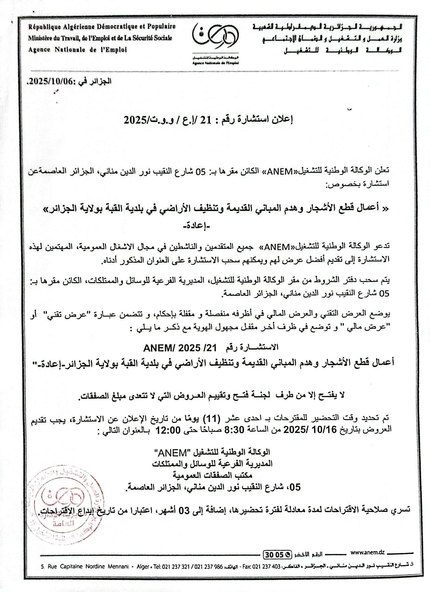 Non classé الوكالة الوطنية للتشغيل تعلن عن استشارة خاصة بأعمال قطع الأشجار و هدم المباني القديمة Rosa Berranem 3 semaines ago 37 Views الوكالة الوطنية للتشغيل تعلن عن استشارة خاصة بأعمال قطع الأشجار و هدم المباني القديمة و تنظيف الأراضي في بلدية القبة بولاية الجزائر Rosa Berranem Publications similaires : Avis de consultation de l’établissement hospitalier spécialisé en appareil locomoteur de Ben Aknoun L’établissement hospitalier de Ben Aknoun lance un avis de consultation pour un l’acquisition de quatre citernes d’eau de 20 000 litres الاعلان عن استشارة متعلقة باقتناء مركبات لفائدة المديرية العامة للصندوق الوطني للتقاعد Le climat des affaires et les opportunités d’investissement à Azerbaïdjan
