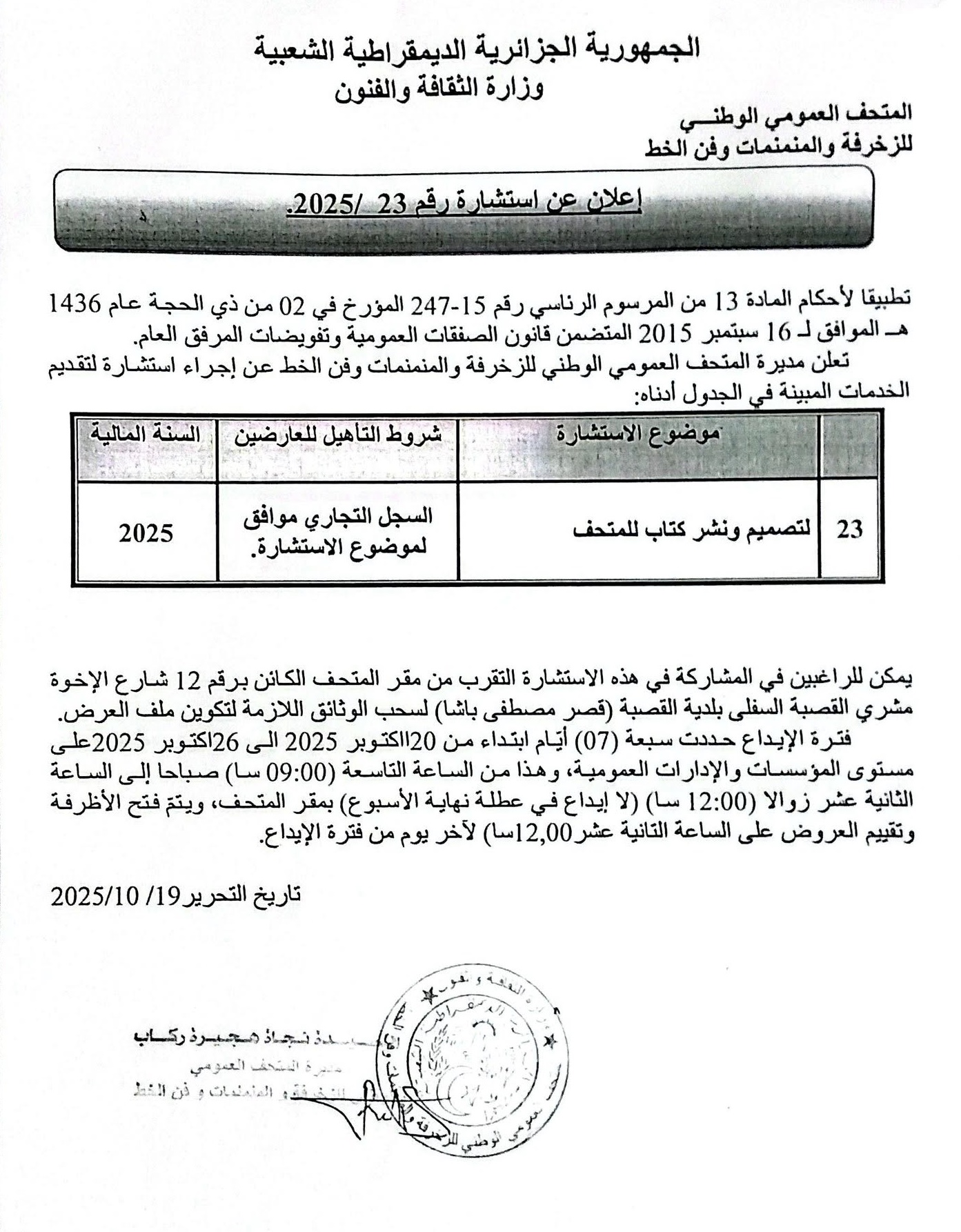 ActualitésAppels d'offres المتحف العمومي الوطني للزخرفة والمنمنمات وفن الخط يعلن عن استشارة لتصميم كتاب للمتحف Rosa Berranem 5 jours ago 34 Views Rosa Berranem Publications similaires : الديوان الوطني للامتحانات و المسابقات : الاعلان عن فتح إستمارة ETABLISSEMENT HOSPITALIER SPECIALISE EN APPAREIL LOCOMOTEUR // AVIS DE CONSULTATION N°55/2023 CDER: Avis de consultation selon les procédures adaptées N°: 04/CDR/2023 وزارة التضامن الوطني و الاسرة و قضايا المرأة