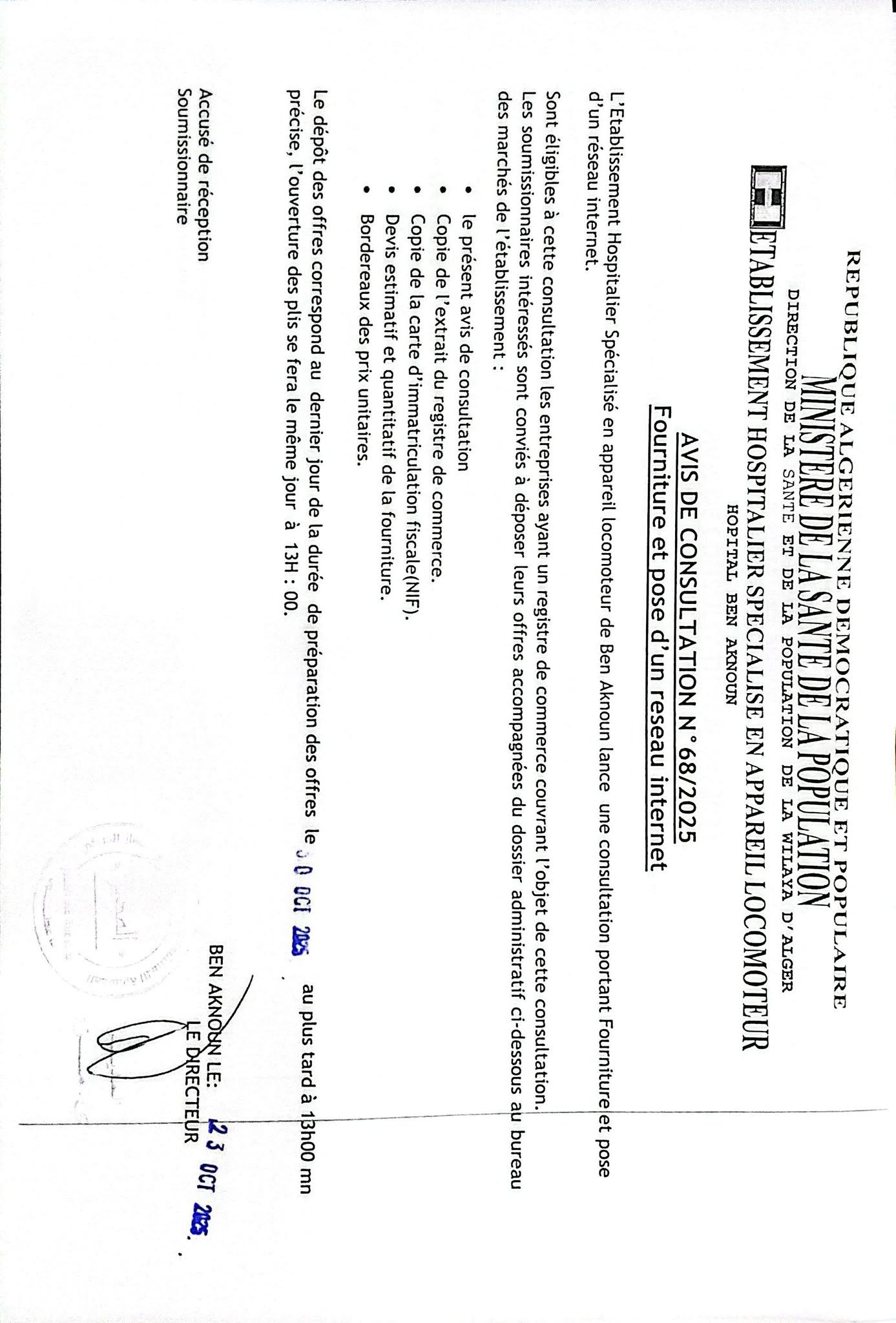 - L’établissement hospitalier de Ben Aknoun lance un avis de consultation pour un l’acquisition de quatre citernes d’eau de 20 000 litres