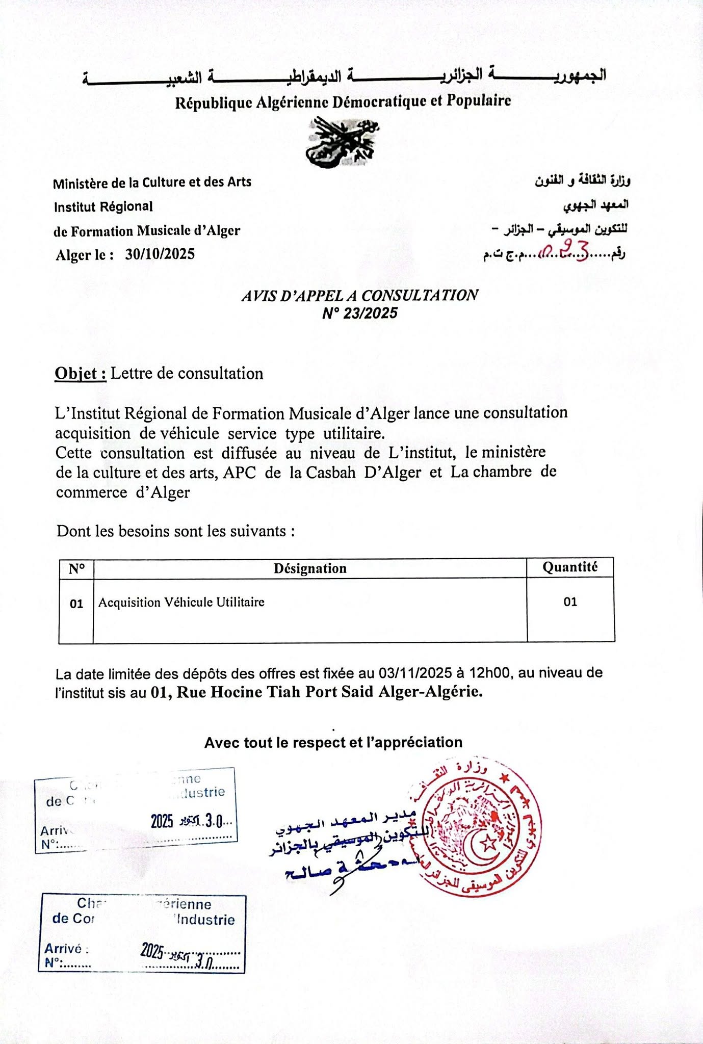 L’Institut Régional de Formation Musicale d’Alger lance une consultation concernant l’acquisition d’un véhicule service
