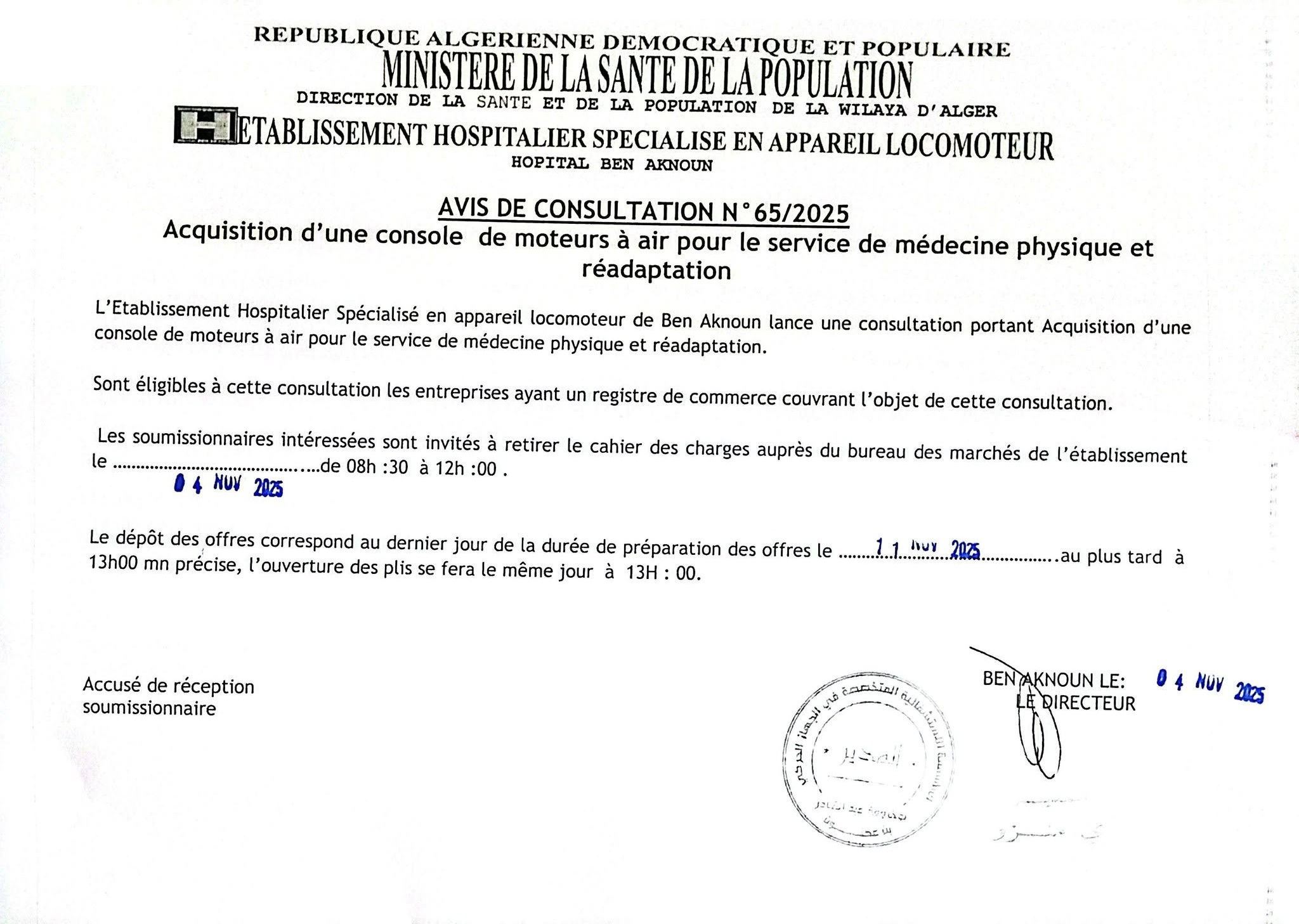 ActualitésAppels d'offres L’etablissement hospitalier specialisé en appareil locomoteur lance un avis de consultation concernant l’acquisition d’une console de moteurs à air Rosa Berranem 3 semaines ago 34 Views Rosa Berranem Publications similaires : الديوان الوطني للامتحانات و المسابقات : الاعلان عن فتح إستمارة ETABLISSEMENT HOSPITALIER SPECIALISE EN APPAREIL LOCOMOTEUR // AVIS DE CONSULTATION N°55/2023 CDER: Avis de consultation selon les procédures adaptées N°: 04/CDR/2023 وزارة التضامن الوطني و الاسرة و قضايا المرأة