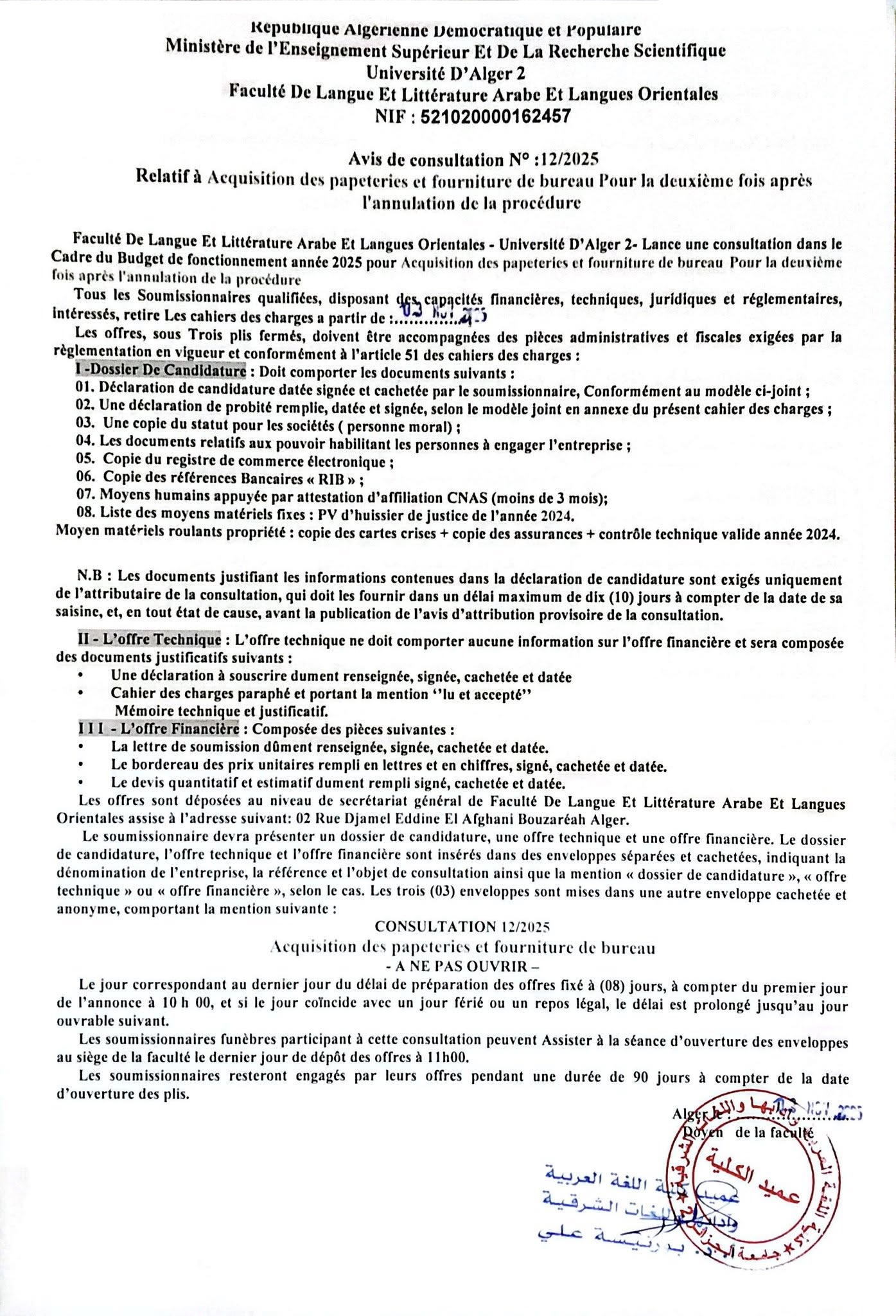 L’université d’Alger 2 lance un avis de consultation relatif à l’acquisition des papeteries et fourniture de bureau
