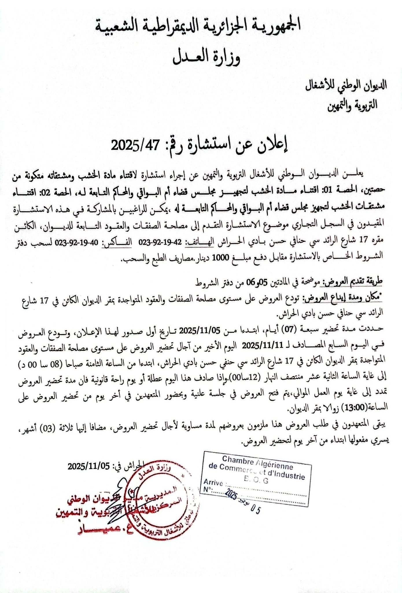 ActualitésAppels d'offres الديوان الوطني للأشغال التربوية و التمهين خاصة باقتناء مادة الخشب Rosa Berranem 3 semaines ago 36 Views Rosa Berranem Publications similaires : الإعلان عن استشارة الخاص بالمديرية العامة للصندوق الوطني للضمان الاجتماعي اعلان عن استشارة رقم 03/2023 CASNOS Etablissement Publique de Santé de Proximité de Baraki : Avis de Consultation N°22/2023 الديوان الوطني للتعليم و التكوين عن بعد