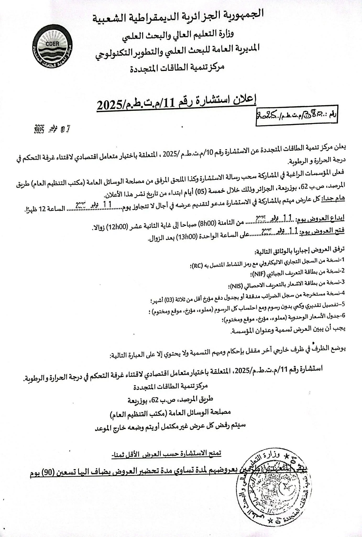 مركز تنمية الطاقات المتجددة يعلن عن استشارة خاصة باختيار متعامل اقتصادي لاقتناء غرفة التحكم في درجة الحرارة و الرطوبة