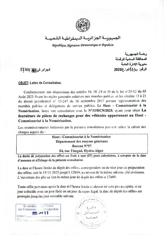 Le Haut Commissariat à la Numérisation lance une consultation concernant la fourniture de pièces de rechanges pour véhicules