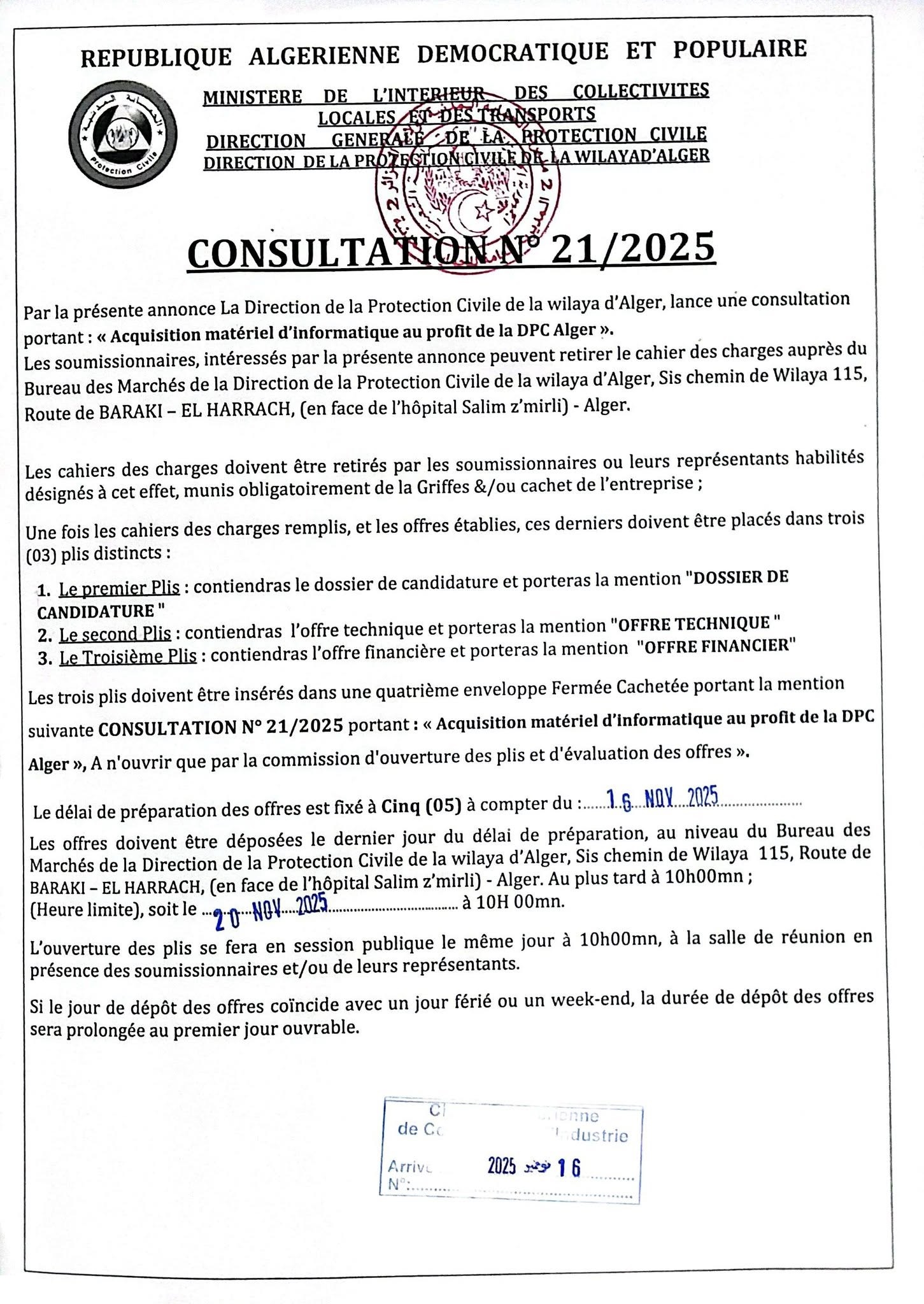 La protection civil fr la wilaya d’Alger lance une consultation concernant l’acquisition de matériel informatique