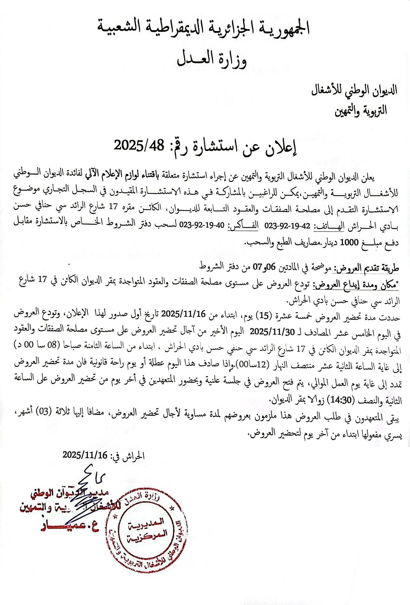 ActualitésAppels d'offres الديوان الوطني للأشغال التربوية و التهين يعلن عن استشارة خاصة باقتناء لوازم الإعلام الآلي Rosa Berranem 7 jours ago 36 Views Rosa Berranem Publications similaires : الإعلان عن استشارة الخاص بالمديرية العامة للصندوق الوطني للضمان الاجتماعي اعلان عن استشارة رقم 03/2023 CASNOS Etablissement Publique de Santé de Proximité de Baraki : Avis de Consultation N°22/2023 الديوان الوطني للتعليم و التكوين عن بعد