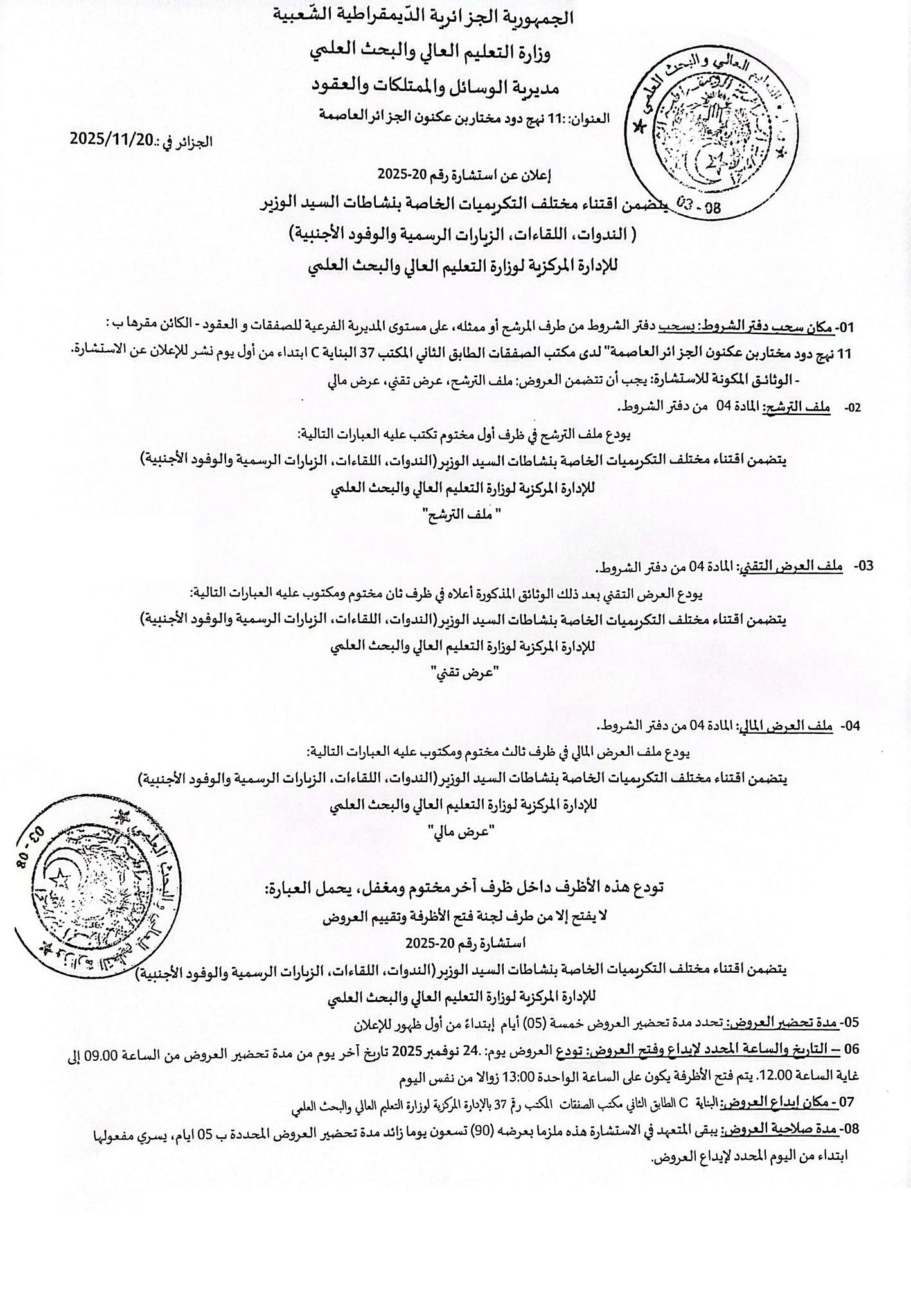مديرية الوسائل و الممتلكات و العقود تعلن عن استشارة خاصة باقتناء مختلف التكريمات