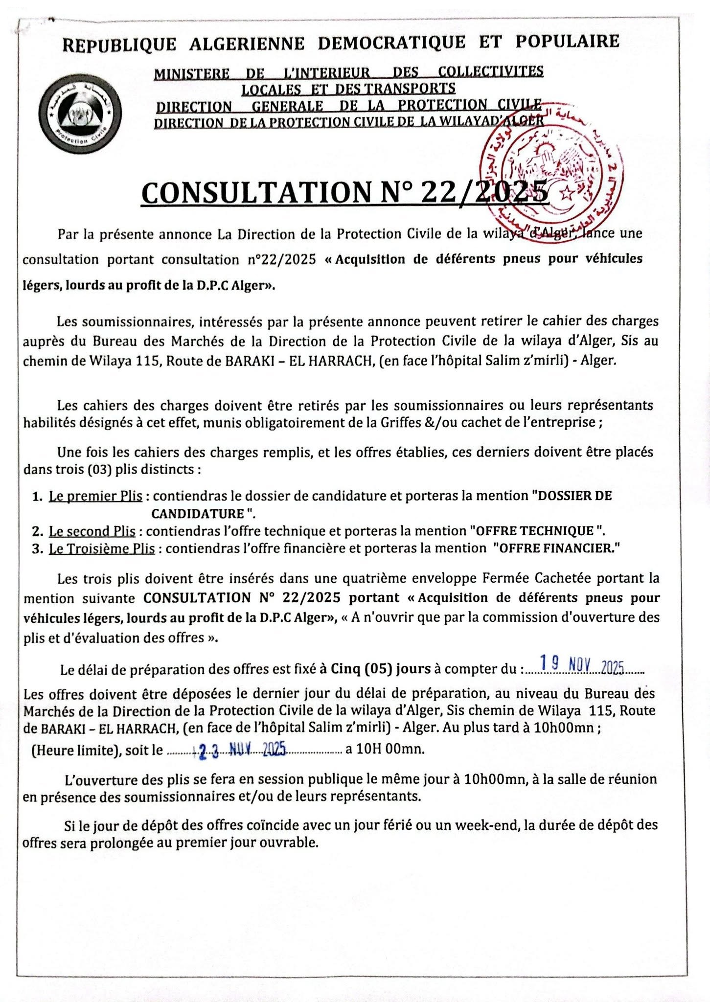 ActualitésAppels d'offresNon classé La direction de la protection civile de la wilaya d’Alger lance un avis de consultation concernant l’acquisition de pneus pour véhicules légers et lourds Rosa Berranem 23 heures ago 34 Views La Rosa Berranem Publications similaires : Coopération algéro-béninoise L’établissement hospitalier de Ben Aknoun lance un avis de consultation pour un l’acquisition de quatre citernes d’eau de 20 000 litres مركز البحث في تكنولوجيا نصف النواقل للطاقوية يعلن عن استشارة اقتناء معدات إعلام آلي CDER: Avis d’appel de demande de Devis