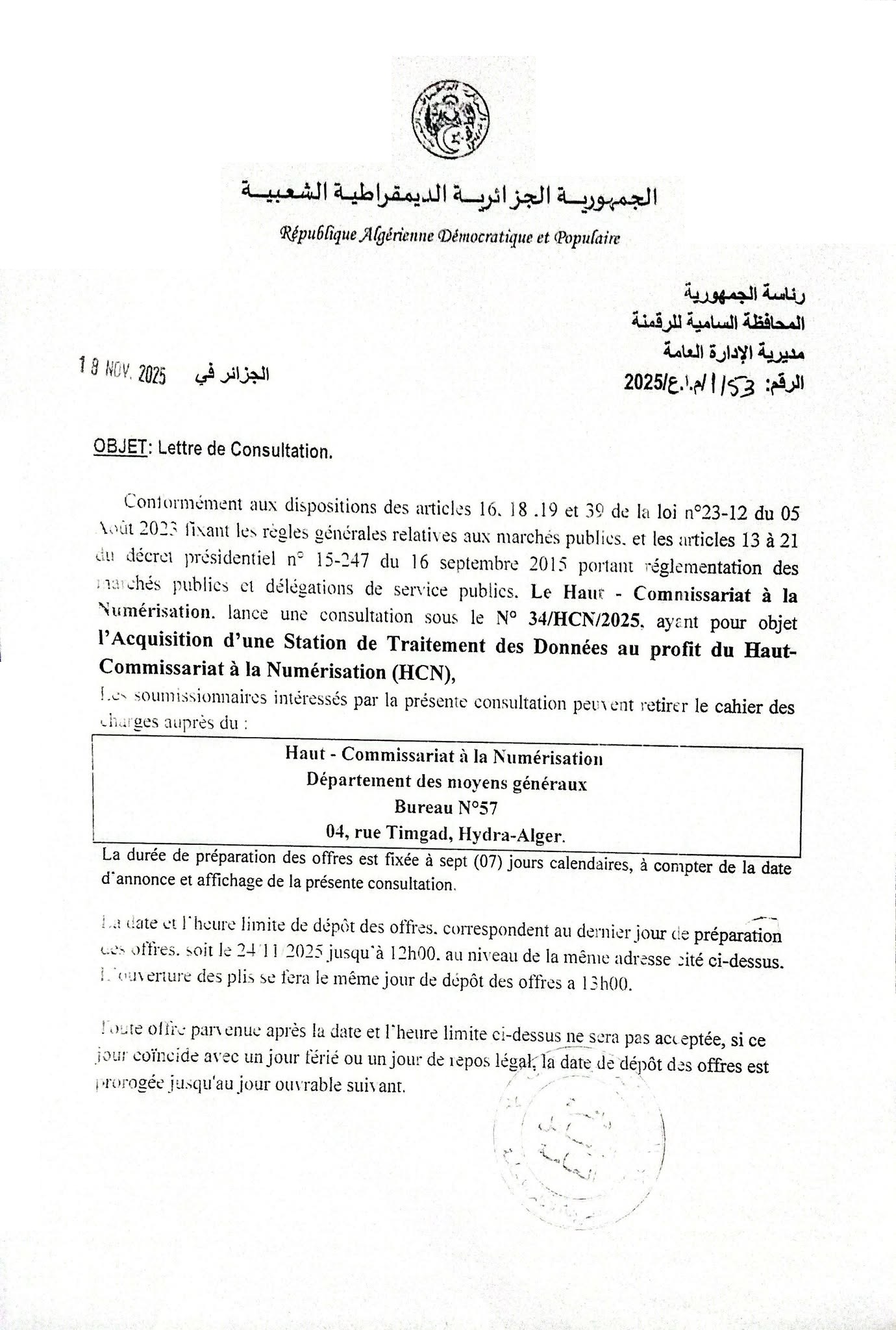 ActualitésAppels d'offres Le Haut commissariat à la Numérisation lance un avis de consultation pour l’acquisition d’une station de traitement de données Rosa Berranem 7 jours ago 35 Views Rosa Berranem Publications similaires : إعلان عن طلب العروض دولي مفتوح متعلق بتقوية تزويدمدينة أغادير بالماء الشروب عن طريق تحلية مياه البحر Coopération algéro-béninoise الديوان الوطني للامتحانات و المسابقات Avis de Consultation N°47/2023