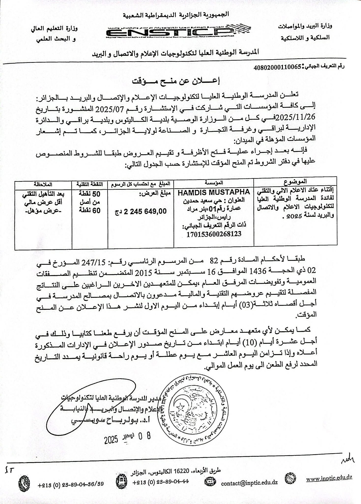 ActualitésAvis d'attribution provisoire المدرسة الوطنية العليا لتكنولوجيات الإعلام و الاتصال و البريد تعلن عن المنح الؤقت للاستشارة رقم 2025/07 Rosa Berranem 2 jours ago 34 Views Rosa Berranem Publications similaires : الصندوق الوطني للتقاعد يعلن المنح المؤقت للاستشارةرقم 2025/05 Tendance du commerce extérieur pour la période de moi d’aout 2014 : le Marbre BRIN Partenariat Algéro-Japonais dans le secteur sanitaire