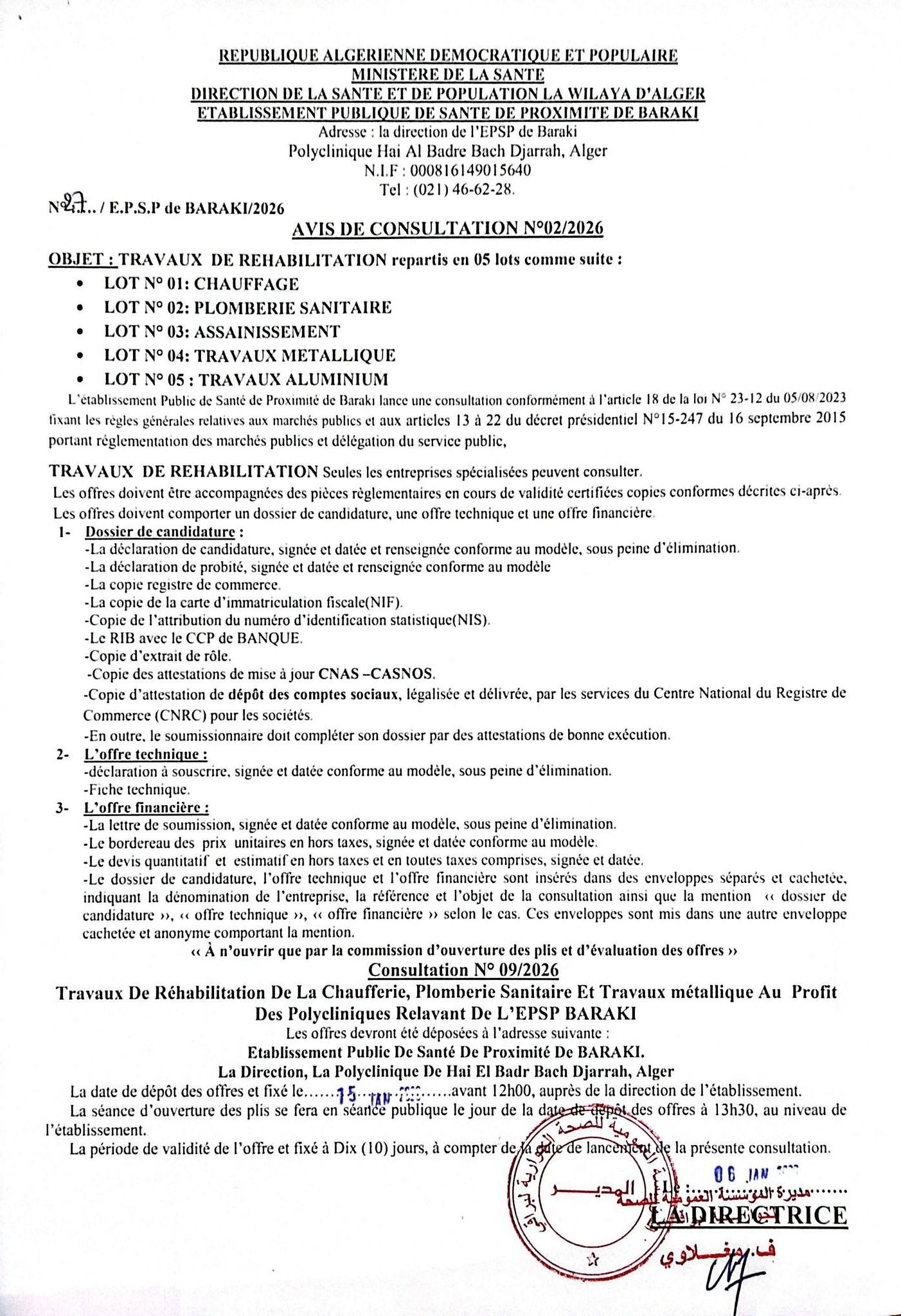 - L’établissement hospitalier de Ben Aknoun lance un avis de consultation pour un l’acquisition de quatre citernes d’eau de 20 000 litres