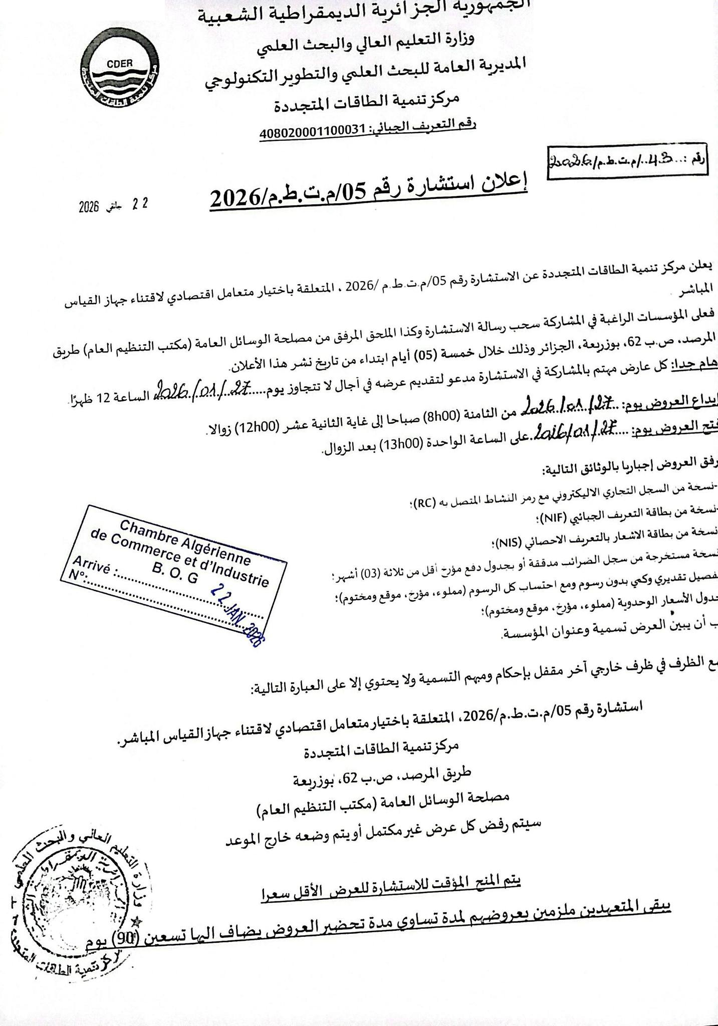ActualitésAppels d'offres المديرية العامة للبحث العلمي و التطوير التكنولوجي يعلن عن استشارة خاصة باقتناء جهاز القياس المباشر Rosa Berranem 2 semaines ago 34 Views Rosa Berranem Publications similaires : إعلان عن طلب العروض دولي مفتوح متعلق بتقوية تزويدمدينة أغادير بالماء الشروب عن طريق تحلية مياه البحر Coopération algéro-béninoise الديوان الوطني للامتحانات و المسابقات Avis de Consultation N°47/2023