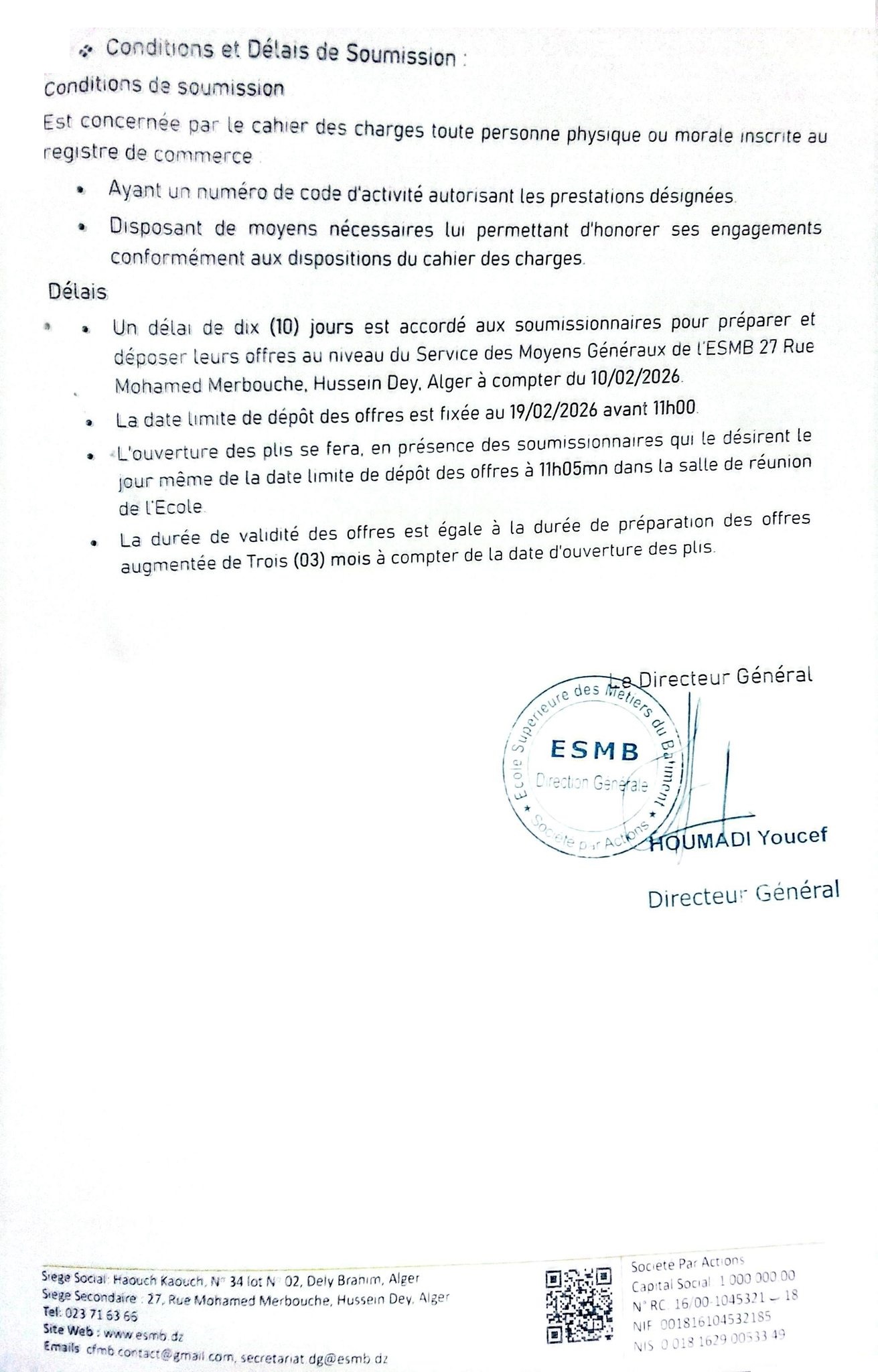 ActualitésAppels d'offres L’École Supérieure des Métiers du Bâtiment lance un avis de consultation concernant la prestation d’hébergement et de restauration Rosa Berranem 14 heures ago 34 Views Rosa Berranem Publications similaires : الإعلان عن استشارة الخاص بالمديرية العامة للصندوق الوطني للضمان الاجتماعي اعلان عن استشارة رقم 03/2023 CASNOS Etablissement Publique de Santé de Proximité de Baraki : Avis de Consultation N°22/2023 الديوان الوطني للتعليم و التكوين عن بعد