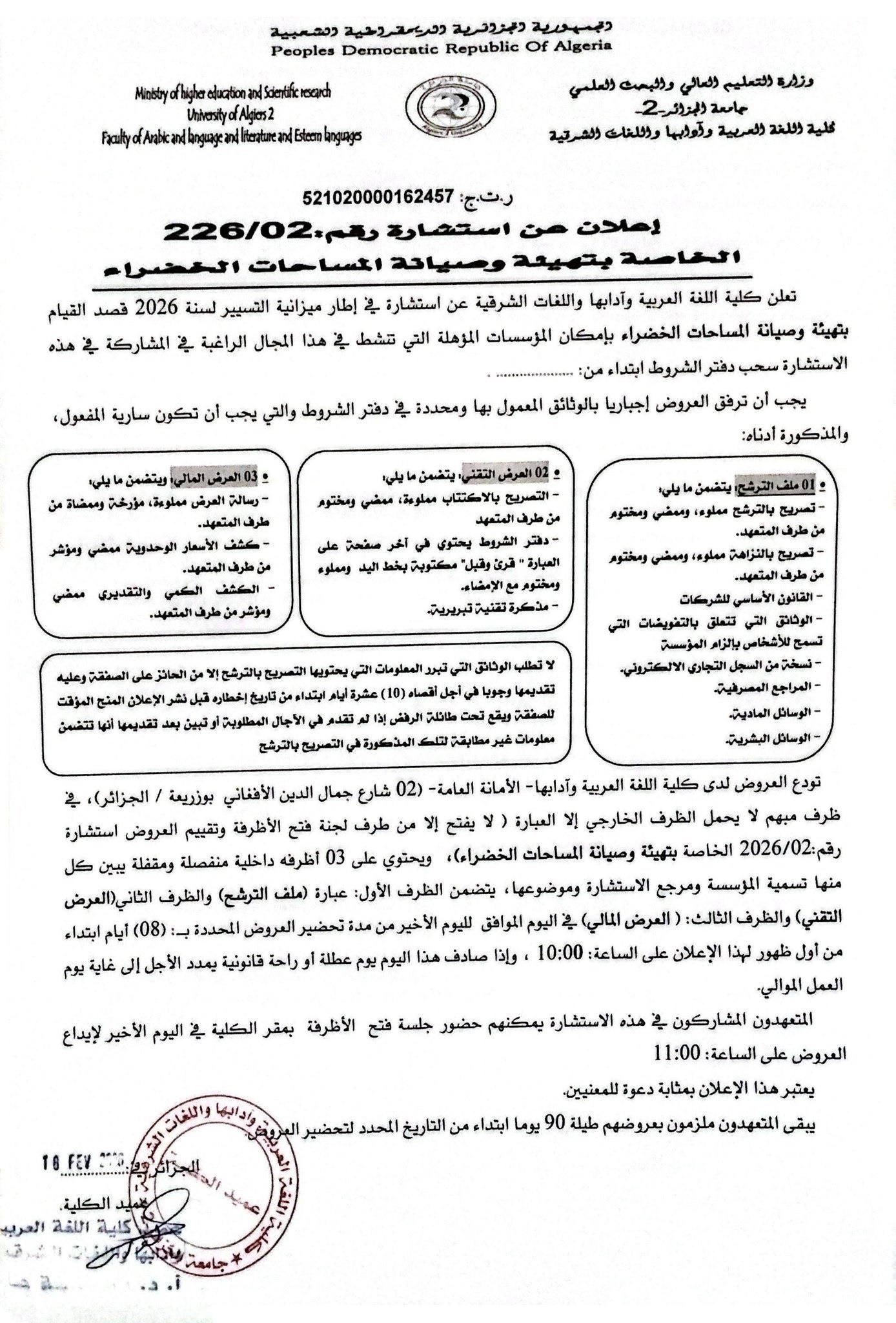 Actualités جامعة الجزائر 2 تعلن عن استشارة خاصة بتهيئة و صيانة المساحات الخضراء Rosa Berranem 1 mois ago 35 Views Rosa Berranem Publications similaires : Tendance du commerce extérieur pour la période de moi d’aout 2014 : le Marbre BRIN Partenariat Algéro-Japonais dans le secteur sanitaire The Swadeshi Industrial Works